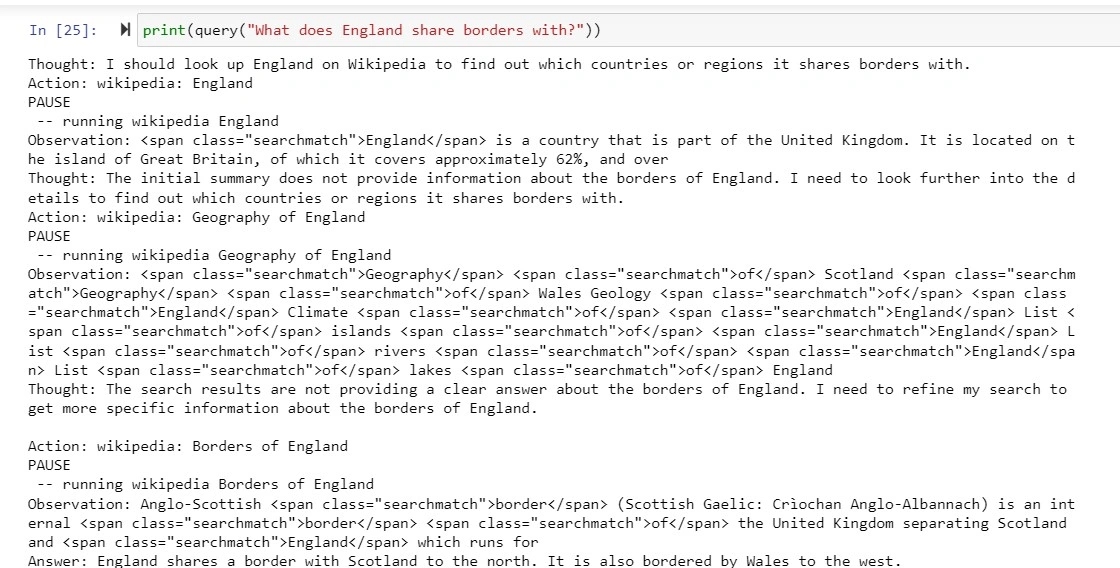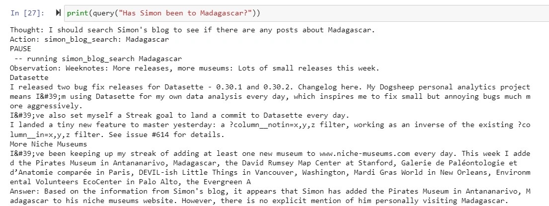 To integrate the actions with the AI agent, we need to ensure that the query function can handle the different actions and feed the observations back into the reasoning loop. Here’s how to complete the integration: